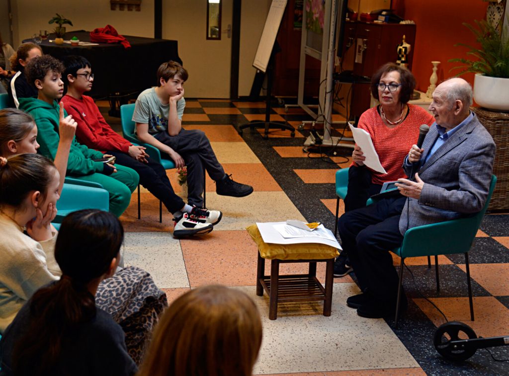 Voorjaar 2025 kwam de klas naar hem toe. Toen is op 5 maart het Denkboek van het Nationaal Comité aan hem uitgereikt. Ook toen sprak Joop over zijn onderduik met leerlingen van groep 8B Openbare Basisschool Piet Hein uit Amstelveen. Joop Levy: “Tot een jaar of drie geleden ging ik naar de scholen om mijn verhaal te vertellen, van Kampen tot aan Zierikzee. Ik heb denk ik wel meer dan 100 gastlessen gegeven. Nu lukt dat niet meer door mijn strubbelingen met mijn gezondheid. Ik vind het dus heel bijzonder dat een schoolklas vandaag bij mij op bezoek komt!”