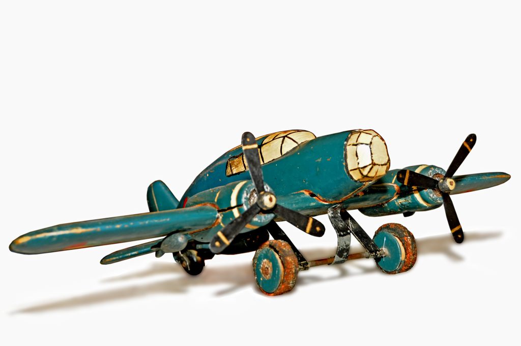 Het houten speelgoedvliegtuigje dat Joop kreeg voor zijn 8e verjaardag in 1943 tijdens zijn onderduik bij de familie Ebbers. Het was gemaakt van een oude houten wc-bril door zijn neef Jonny Levy en een Russische piloot Alex Sidorov die beiden ondergedoken zaten bij de familie Geurink in Lichtenvoorde. Het was een bommenwerper zoals Joop deze hoorde overkomen vanuit zijn schuilplaats boven de paardenstal. Foto: pr Nationaal Onderduikmuseum